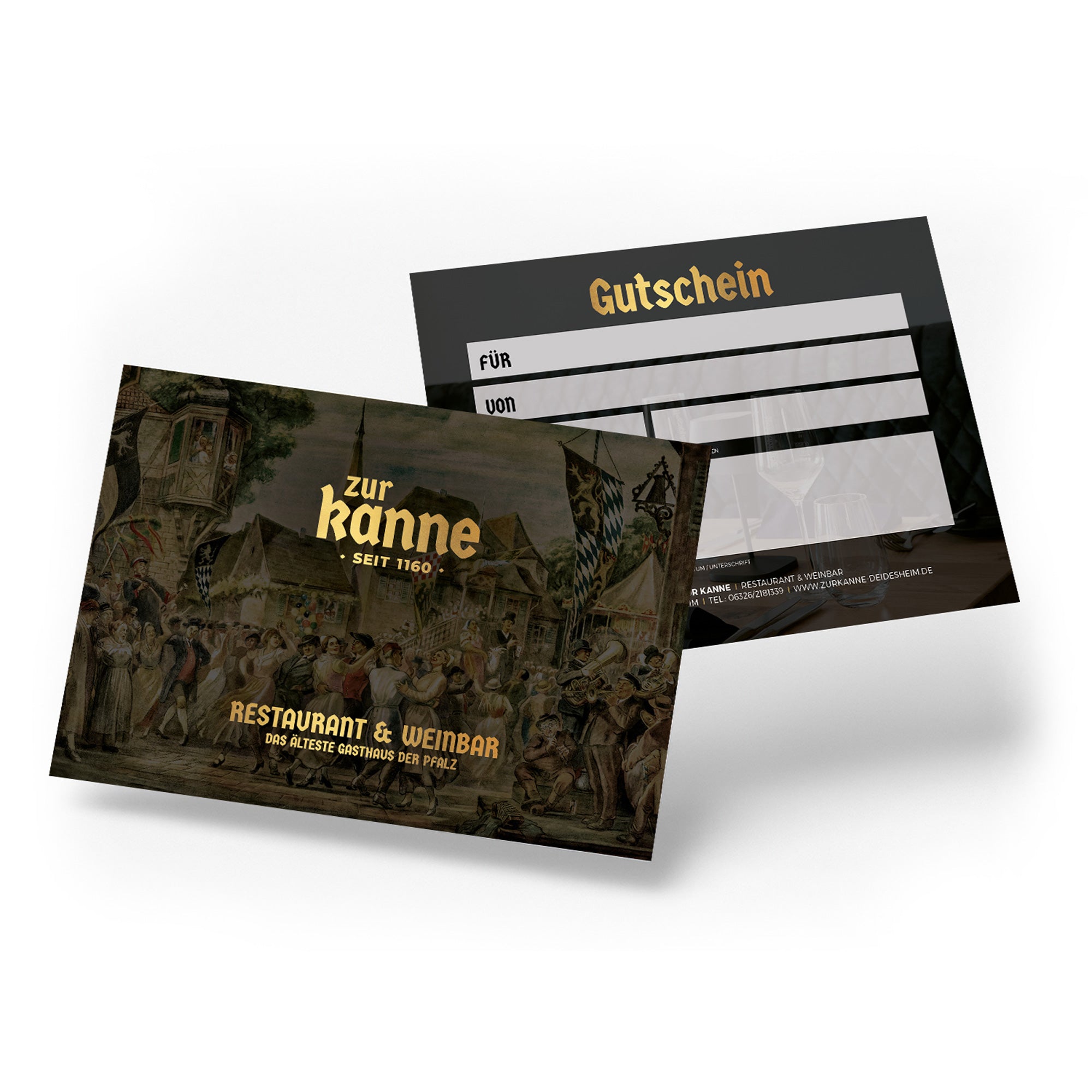 Nach Zahlungseingang bereiten wir deinen persönlichen Gutschein im Gasthaus Zur Kanne vor und versenden ihn per Post an dich.